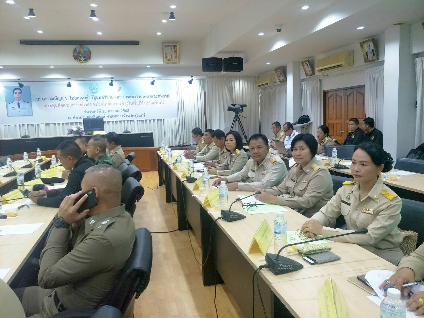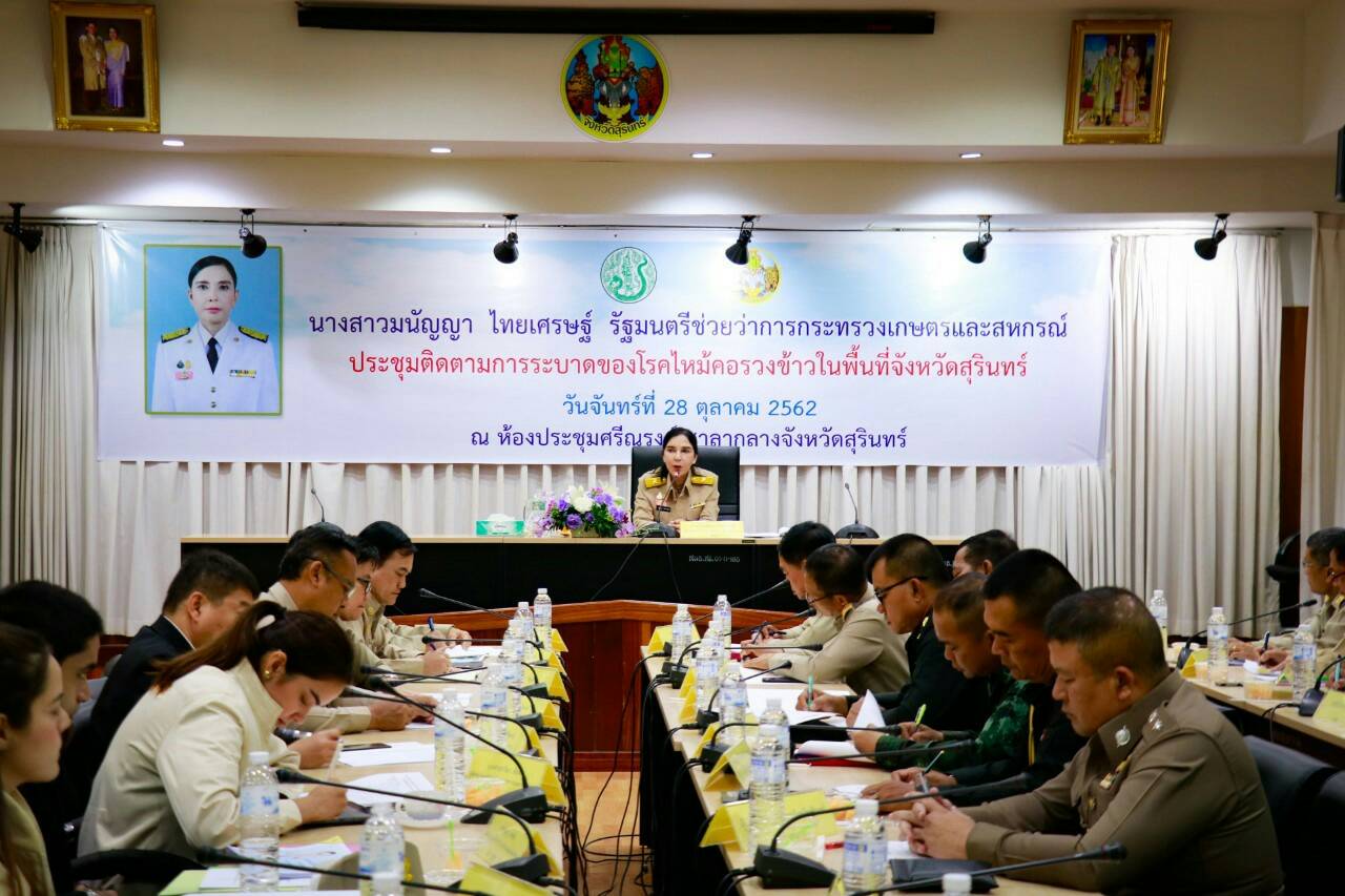 วันที่ 28 ตุลาคม 2562 นางสาวมนัญญา ไทยเศรษฐ์ รัฐมนตรีช่วยว่าการกระทรวงเกษตรและสหกรณ์ เป็นประธานการประชุมติดตามการระบาดของโรคไหม้คอรวงข้าวในพื้นที่จังหวัดสุรินทร์ และมี นางสาวอิงอร ปัญญากิจ รองอธิบดีกรมวิชาการเกษตร นางนวลจันทร์ ศรีสมบัติ ผอ.ศวพ.สุรินทร์ นายสวัสดิ์ สมสะอาด ผอ.ศวพ.บุรีรัมย์ และนายบุญชู สายธนู ผอ.กลุ่มประสานและบริหารนโยบาย ผู้แทน ผอ.สวพ.4 ร่วมประชุมติดตามฯ ในครั้งนี้ ณ ห้องประชุมศรีณรงค์ ศาลากลางจังหวัดสุรินทร์